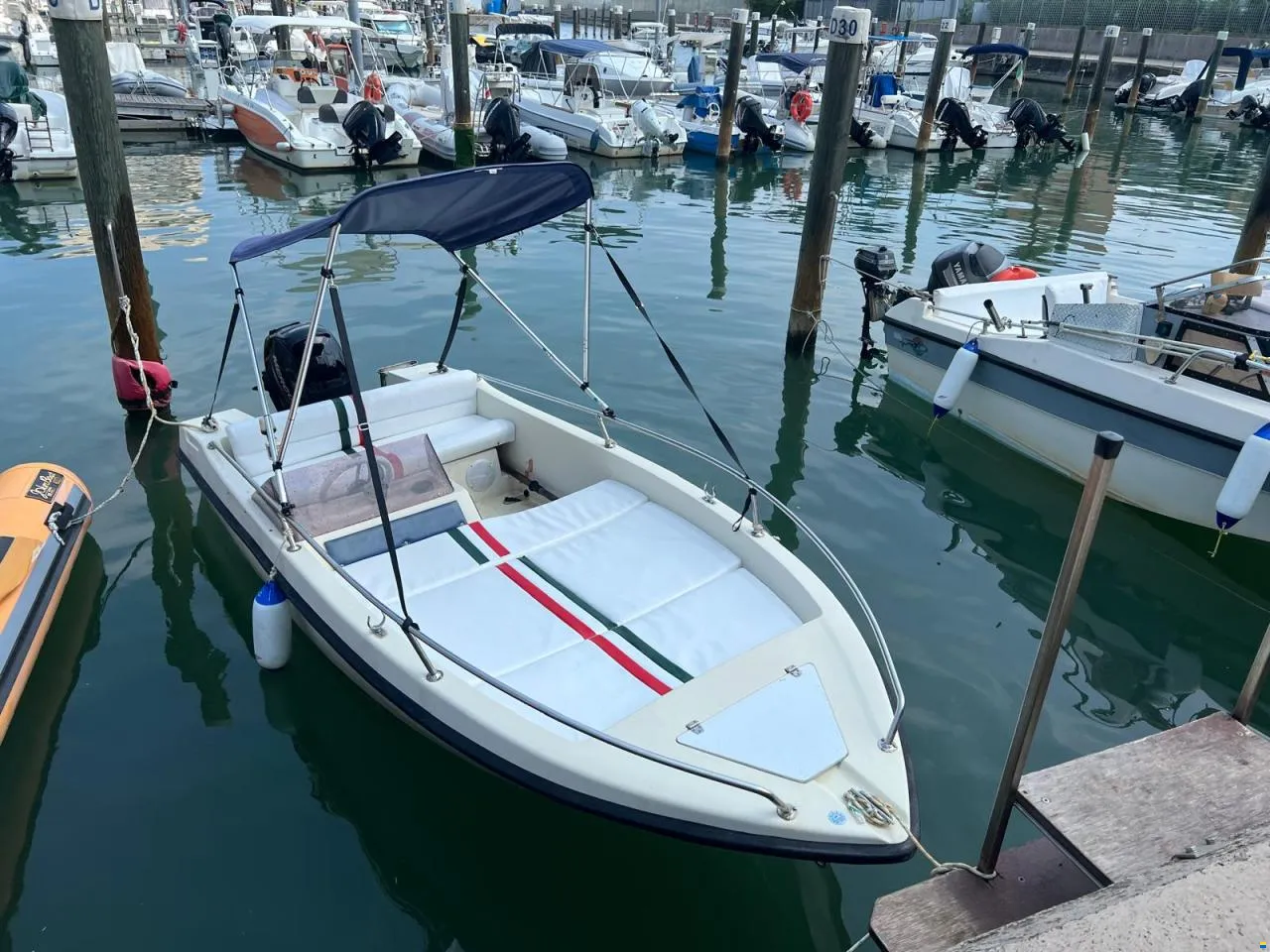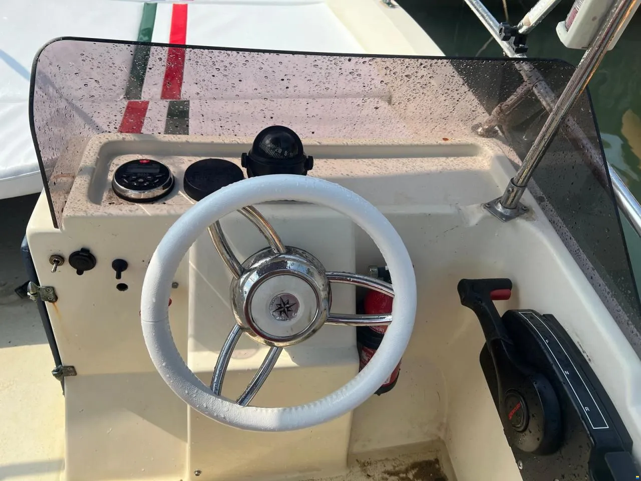 ACCESSORI: TENDALINO T-TOP NUOVO, PARAVENTO IN PLEXIGLASS, VOLANTE IN PELLE MARINA BIANCO CON 6 RAZZE CROMATE, TIENTIBENE IN ACCIAIO INOX 360, SCALETTA PROLUNGATA IN ACCIAIO INOX CON CORRIMANO IN ACCIAO INOX, IMPIANTO AUDIO CON 2 CASSE DA 150W CADAUNO, POTENZA TOTALE 300W, CON STEREO BOSS MARINE 2025 BLUETOOTH E RADIO DAB, BUSSOLA, TAPPEZZERIA CUSCINI IN PELLE MARINA TOTALE CON INSERTO TRICOLORE ITALIANO, LUCI DI VIA NOTTURNE, POMPA SENTINA ELETTRONICA, ANCORA, VARI VANI PORTA OGGETTI SALVASPAZIO, PARAVENTO IN PLEXIGLASS, MEZZO MARINAIO IN ALLUMINIO ANODIZZATO TELESCOPICO DA 2 MT, PARABORDI, ECC..ECC..
