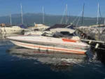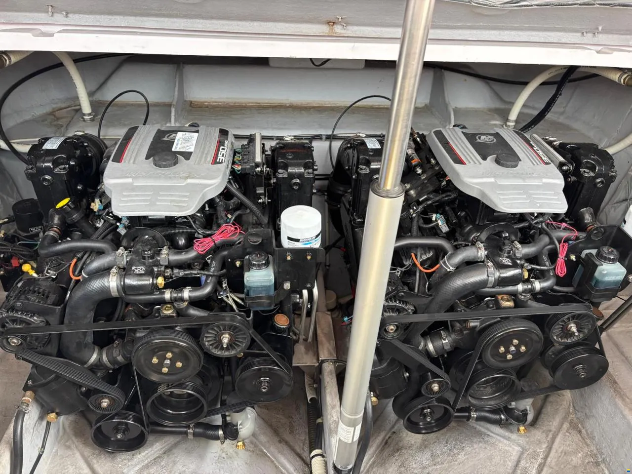 La propulsione è affidata a un motore entrofuoribordo Mercruiser 350 Magnum, con doppia motorizzazione da 304 CV ciascuno (totale 608 CV), ideale per chi ama navigare con grinta e sicurezza. Il serbatoio carburante da 580 litri garantisce ottima autonomia. Le ore moto sono 430.