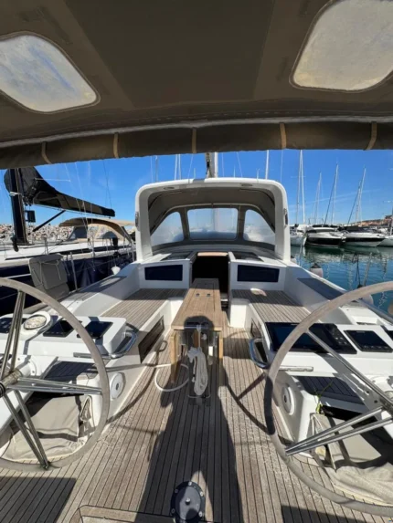 Facilità d’uso in solitaria, sicurezza, velocità, autonomia, comfort e bellezza hanno guidato l’armatore nel personalizzare l’imbarcazione, rifinita in rovere chiaro e dotata di 3 cabine e 2 bagni. La conduzione è facilitata dalla randa avvolta nell’albero, dal fiocco autovirante e da quattro winch elettrici, due con funzione rilascio e tutti con comandi riportati su entrambe le torrette delle timonerie (soluzione originale e particolarmente riuscita!). Nella medesima ottica si segnala l’elica di prua, 75 metri di catena gestibili anche con telecomando, la spiaggetta elettrificata e telecomandata. Massima attenzione è stata posta all’autonomia che viene assicurata da tre potenti pannelli solari (invisibili in quanto incernierati sopra il bimini), da un dissalatore (65 litri/ora) e da due frigoriferi (all’occorrenza freezer). Le prestazioni sono esaltate dal Code 0 e dal motore potenziato di 60 HP. Un potente inverter, un bagno elettrificato, l’impianto stereo, il pozzetto in teak e la delfiniera in carbonio, completano gli accessori.